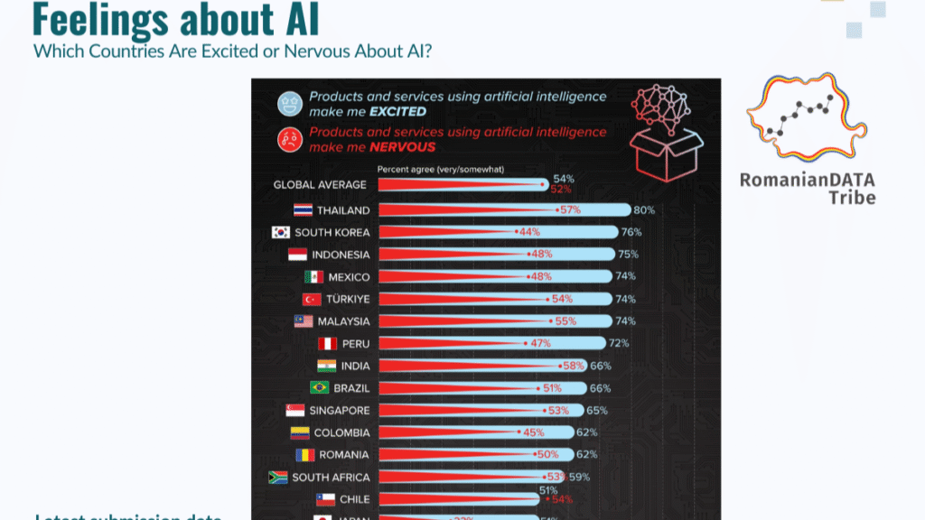 📊 Feelings about AI 📊 Which countries are Excited or Nervous about AI? Globally, there’s mixed feelings towards AI-powered products and services: 54% of people are excited, and 52% of