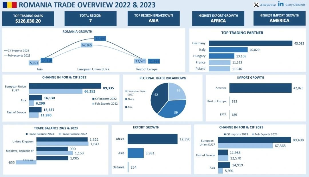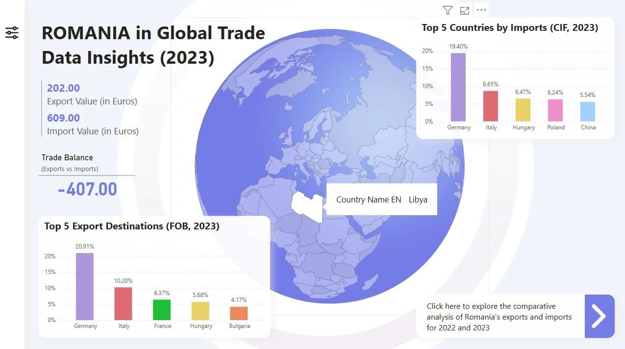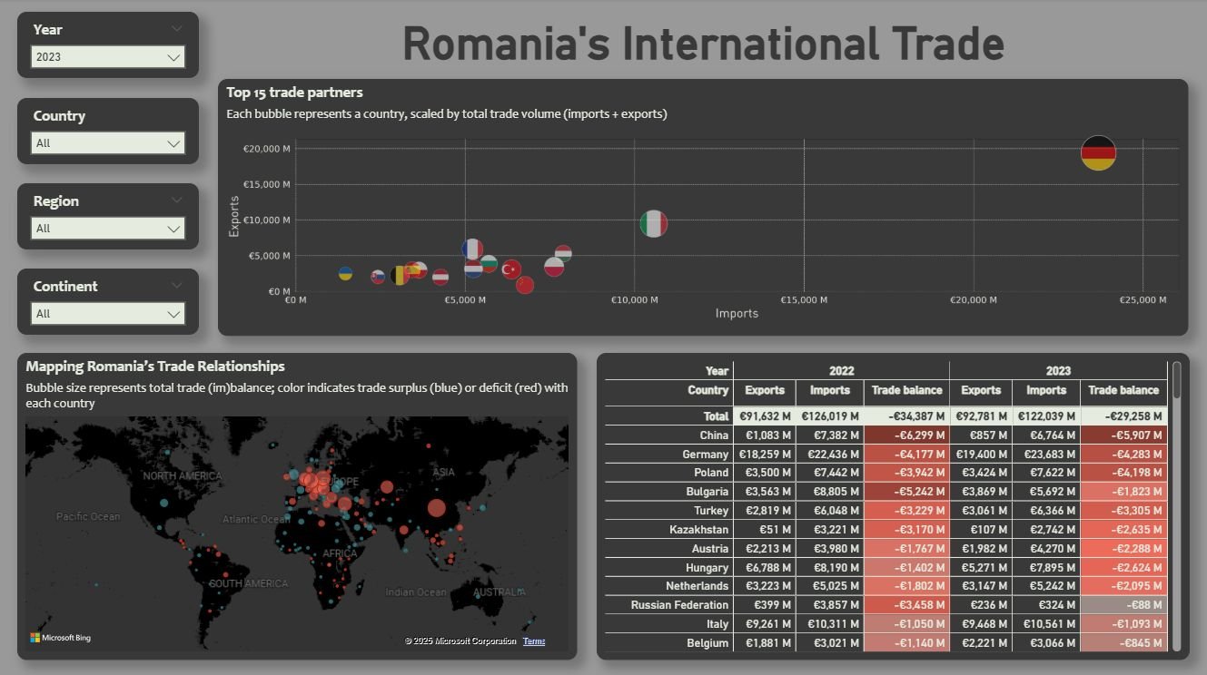 The dataset includes official trade data showcasing Romania’s import and export activities by country.